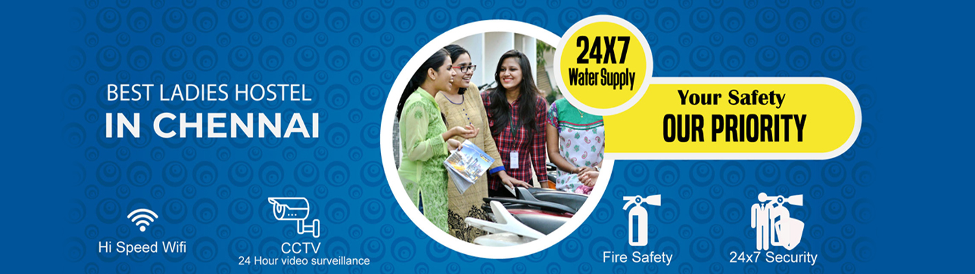 Girls & Women Hostel in Chennai with Top Facilities like A/C & Cooler Rooms, Tea, Coffee, LCD TV with DTH, WI- FI Connectivity, 24 Hrs Maid, 24 Hrs Guard, Power Back-up, Home made meals (Veg / Non-Veg), Transportation Available